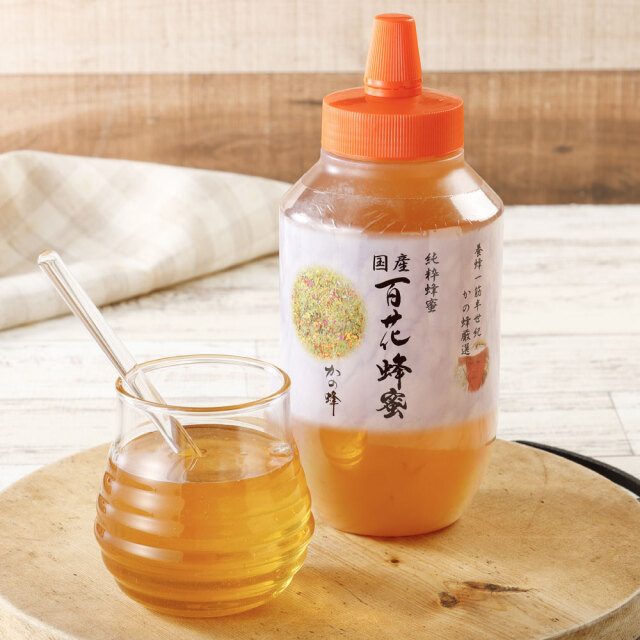 かの蜂の国産百花蜂蜜はレンゲの花や菜の花、山の花など色々な花が咲き乱れる春先にミツバチたちが集めてきた蜂蜜です。香り、うま味ともに舌触りまろやかで後味もスッキリとしています。