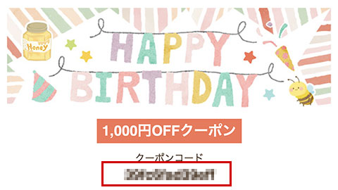 ①誕生日メール(誕生日月の1日配信)の『クーポンコード』を確認します。