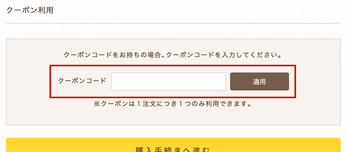 ②商品がカートに入った状態で、カートページ内の「クーポン利用」項目にて、クーポンコードを入力し、「適用」をクリックします。
