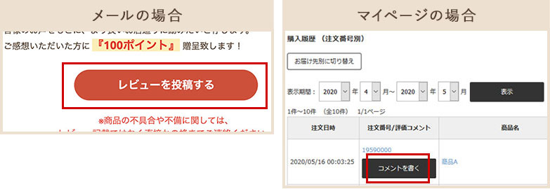 ①購入後届く『レビュー投稿メール』にて「レビューを投稿する」をクリック、またはマイページにて『購入履歴』の「コメントを書く」をクリックします。