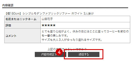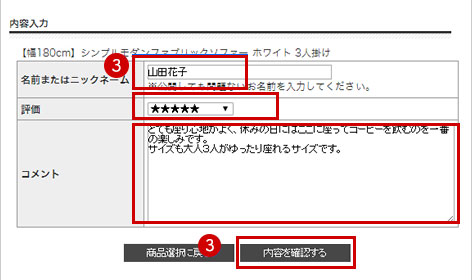 ③『名前またはニックネーム』『評価』『コメント』を入力し、「内容を確認する」をクリックします。